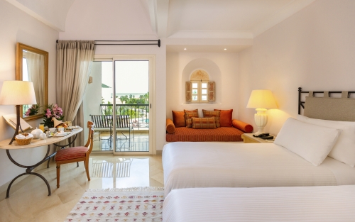 • Suite: Die ca. 91m² großen Suiten bestehen aus einem separaten Wohn- und Schlafbereich sowie einem Badezimmer mit Dusche und Badewanne und einem kleinem Ankleidezimmer. Vom Balkon aus genießt man einen Ausblick auf den Pool oder, gegen Aufpreis, auf das Meer.